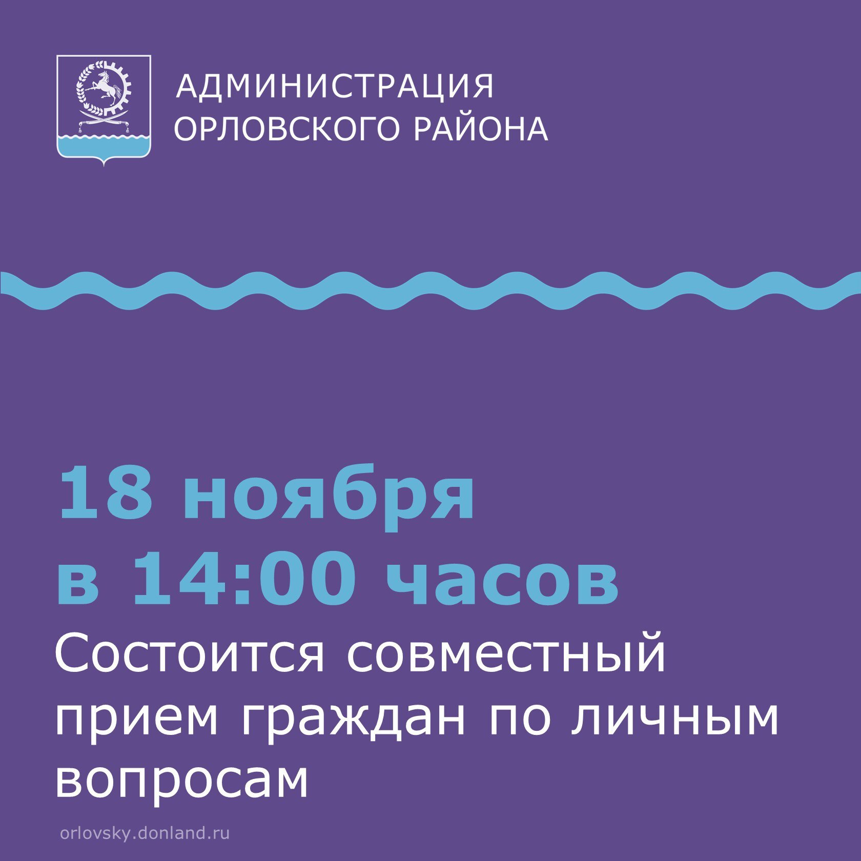 18 ноября в 14:00 в малом зале администрации Орловского района состоится совместный приём граждан по личным вопросам.