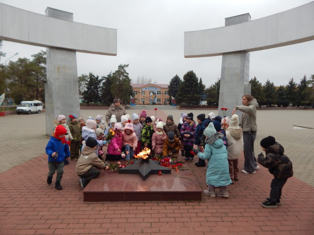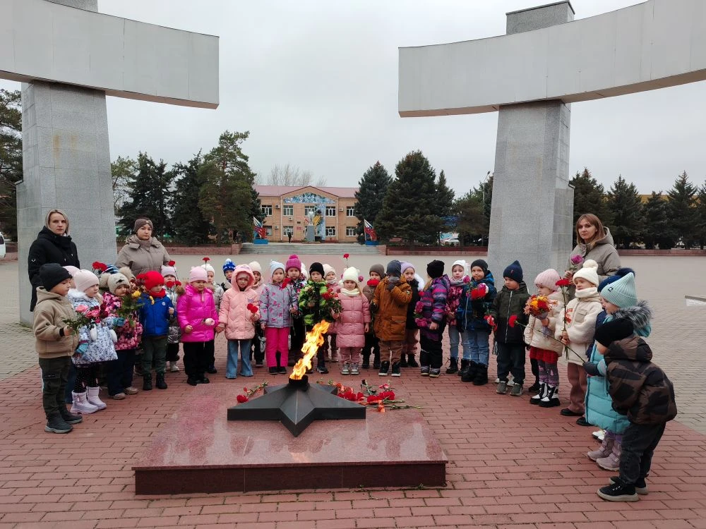 В посёлке Орловском к Вечному огню пришли представители предприятий и организаций, учреждений образования, ветераны труда. Отрадно, что в лучших традициях патриотического воспитания в возложении организованно приняли участие малыши и школьники. На фотографии ребята из детского сада “Весёлая планета”.