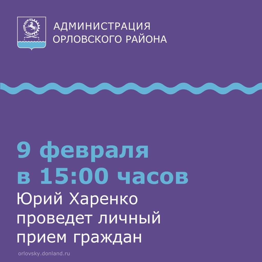 9 февраля 2026 года приём граждан по личным вопросам главой Орловского района Юрием Харенко будет проводиться с 15:00 в Администрации Орловского района.