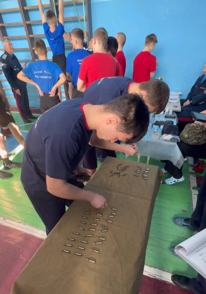 После представления судейства и регламента турнира начались соревнования. Кадеты разбирали и собирали автомат, подтягивались, стреляли из пистолета, надевали противогаз и переносили раненого.
