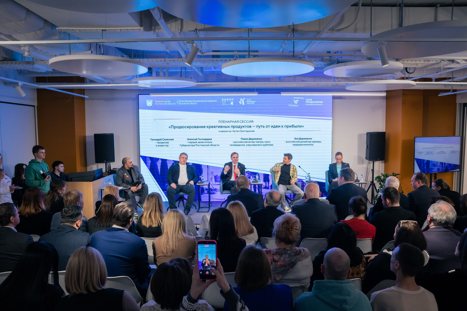 На пленарной сессии «Продюсирование креативных продуктов – путь от идеи к прибыли» амбассадор клуба Павел Деревянко поделился своим видением развития креативных индустрий с учетом культурного кода Дона. Он провел публичный разбор проектов резидентов ЦКИ, дав рекомендации по их развитию.